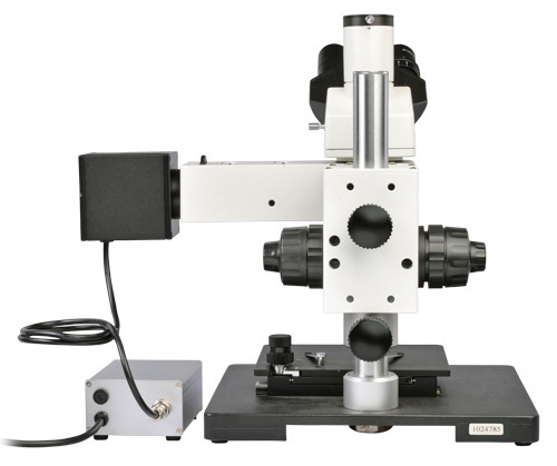 RM-5400TLの本体部分は、顕微鏡スタンドの支柱に対して任意の高さで固定できます。従って、厚さの薄い標本はもちろんのこと、非常に厚みのある標本でも観察可能です。標準仕様の顕微鏡スタンドを利用した場合は最大115mm厚のサンプルまで観察可能です。ロングピラータイプの顕微鏡スタンドを利用すると約415mm厚のサンプルまで対応できます。